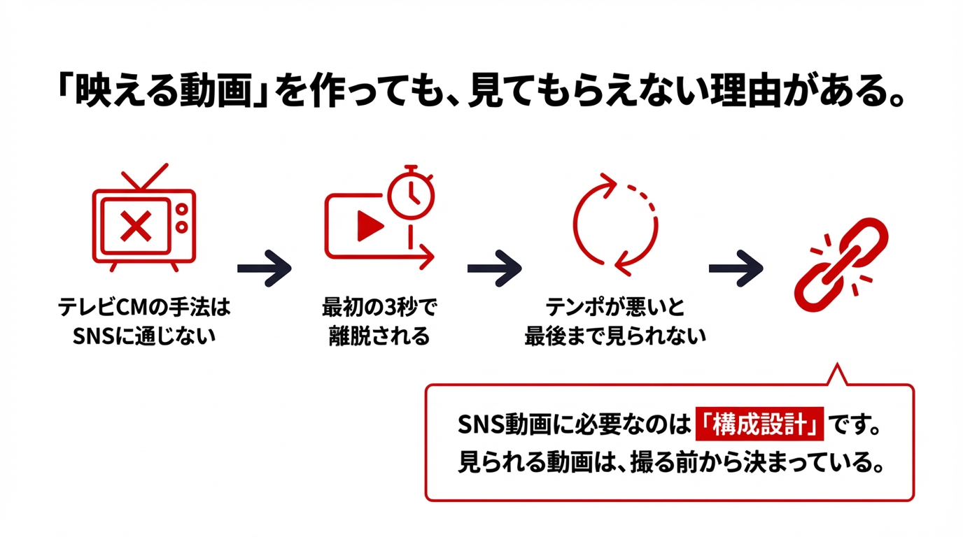 “きれいな映像”より、“見られる構成”を優先したSNS動画を制作します。